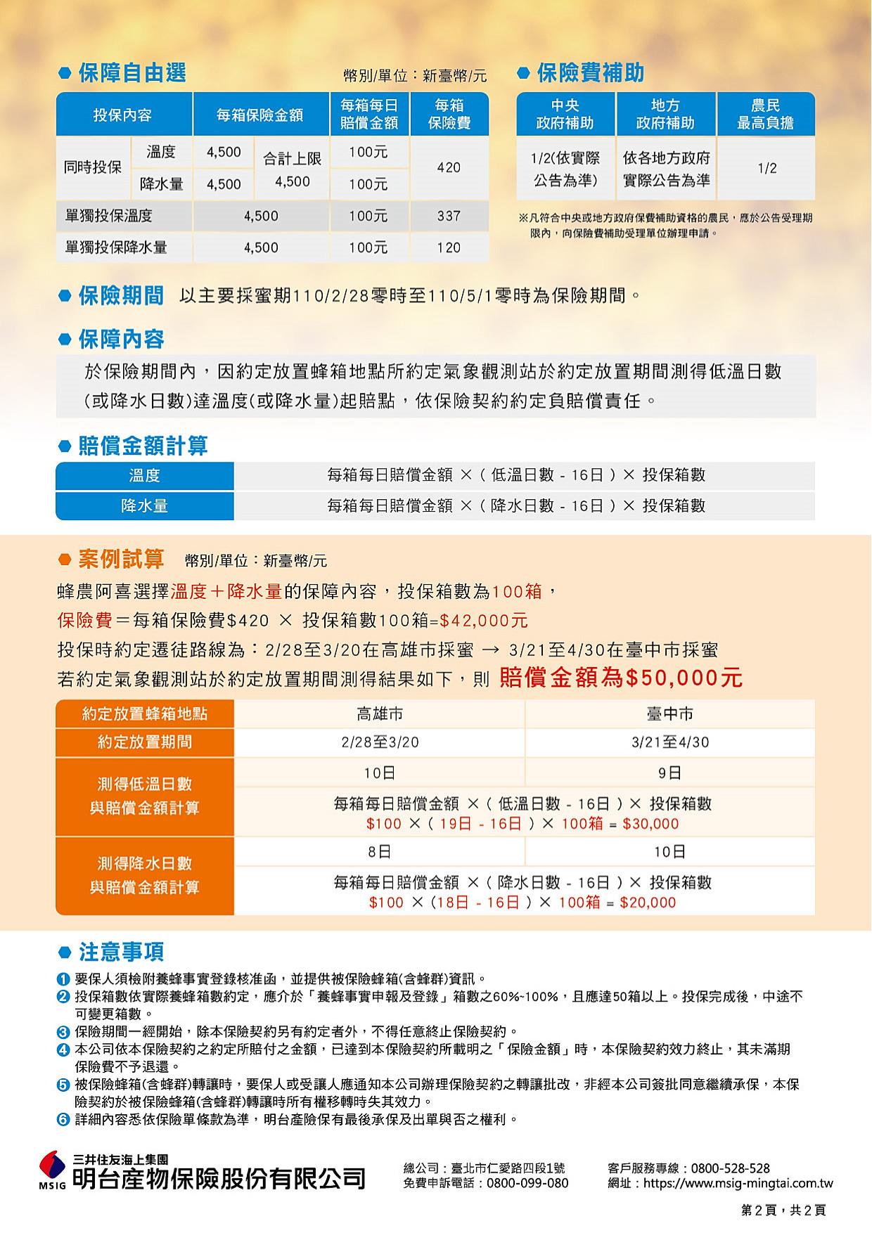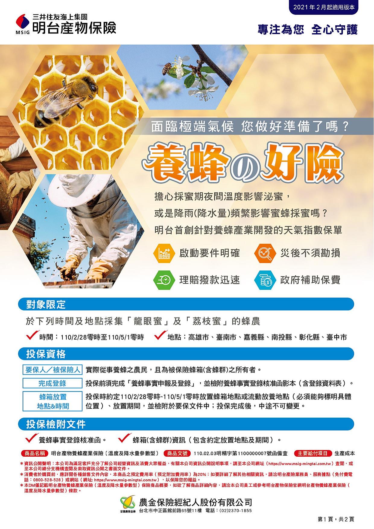 一、『明台產物養蜂產業保險(溫度及降水量參數型)』業已於本(112)年1月18日經農委會公告為農產業保險商品,農民投保該保險商品,得依農業保險保險費補助辦法規定向農委會申請補助保險費1/2,銷售截止日為112年3月30日。